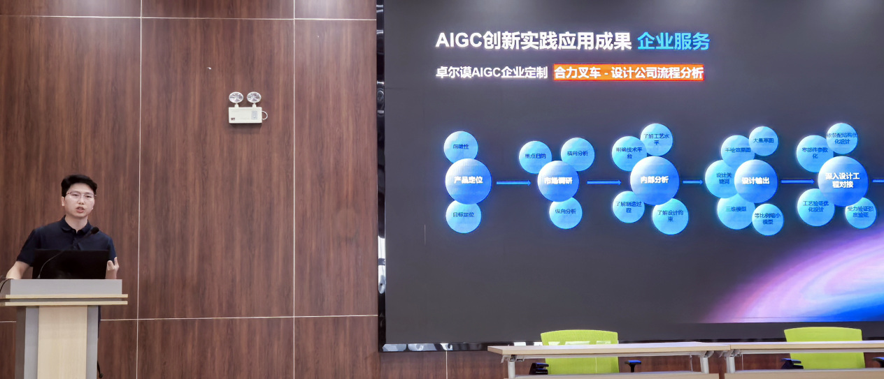 卓尔谟科技有限公司创始人沈应龙先生也进行了分享。他表示AIGC技术已在智能汽车、智能家居、消费电子等多个行业落地应用,并指出AI在整个设计流程中都发挥着关键作用。此外还介绍了一系列有助于设计的软件,如即梦、Chat GPT 、Midjourney等。
