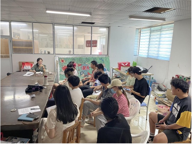 会议第一项,吴娴老师向同学们介绍了皖南黄高峰青年学习学院基本情况,告诉同学们此次三下乡活动围绕喜迎二十大、庆祝建团100周年、弘扬红色文化主题,我们将主要开展红色教育宣传册制作、海报设计、视频制作、农产品包装设计等活动。