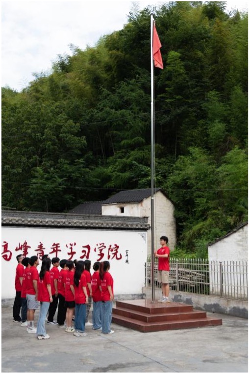下午两点半,三下乡社会实践重点团队指导老师吴娴和当地村干部带领16名队员穿过上世纪60年代人工开凿的金岭洞,前往皖南黄高峰青年学习学院参观学习,当地村干部向队员们介绍,绩溪县长安镇梧川村曾是新四军游击队在皖南建立的第一个革命根据地,境内有号称“皖南井冈山”的黄高峰、绩溪县“红旗渠”精神教育基地“金岭洞”、百坑会议遗址等红色教育资源。1947年9月底,中共旌绩歙宁昌工委在这里召开了为期十天的区、连级以上干部扩大会议,史称“百坑会议”,这次会议在整个皖浙边游击战争史上产生了重大影响。宣城团市委、绩溪团县委与梧川村合作,充分挖掘整合当地的红色资源,在百坑会议旧址上创办了皖南黄高峰青年学习学院,2021年学院被确定为宣城市第二届爱国主义教育示范基地。吴娴老师和队员们到达黄高峰青年学习学院后,对学院进行了参观,我们现场升起国旗,共同重温入团誓词,当地村干部带领参观了青年学院,并对学院发展历史进行了讲解,全体队员合影留念。