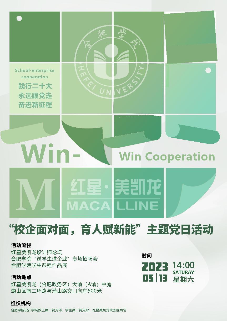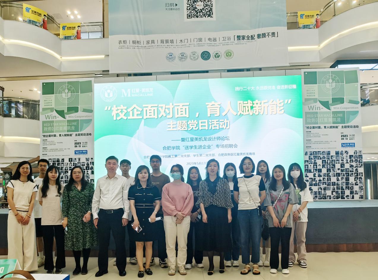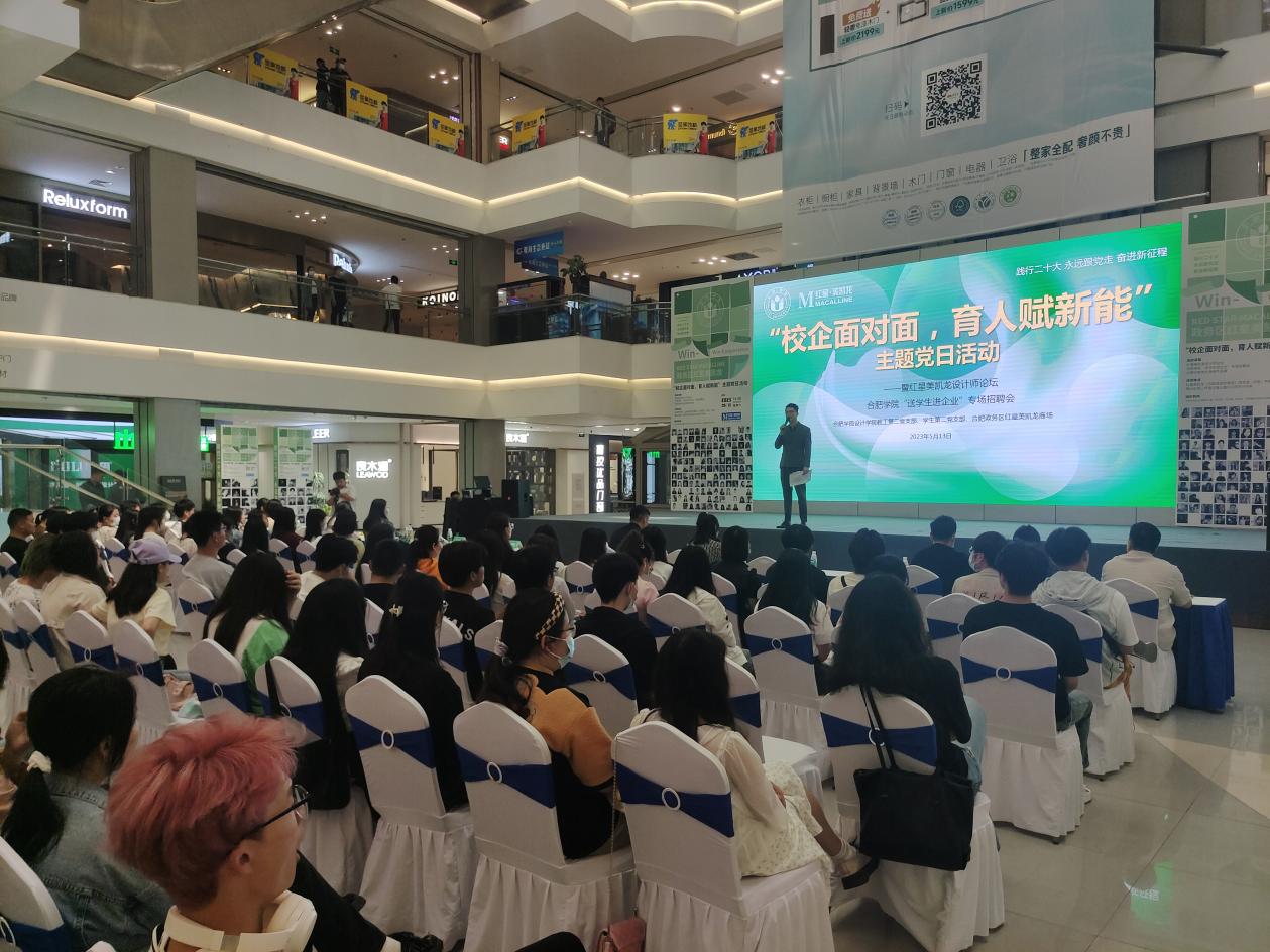 提升设计学院教工、学生党支部建设水平,发挥党员特色服务先锋作用进一步拓宽毕业生就业渠道,提升精准就业服务水平,513日,合肥学院设计学院教工第二党支部、学生第二党支部联合红星美凯龙在政务区红星美凯龙商场举办了校企面对面,育人赋新能”主题党日活动暨红星美凯龙设计师论坛设计学院教工第二党支部书记、空间设计系主任水源、徐贤如、吕琴琴、张行舟等专业老师出席,学生第二党支部全体党员参加。