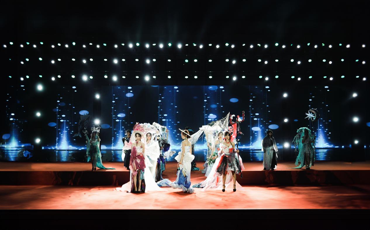 在比赛中,设计学院模特队20位模特身穿我院设计师设计的服装闪亮登场。我院系列作品充分考虑了环保和可持续发展的原则,巧妙运用空易拉罐、矿泉水瓶、旧作业本、旧布料、废弃塑料袋、树枝树叶等环保材料,将海洋与环保主题有机结合,不仅展现了精美的服装,更体现了对资源节约和环境友好的追求。