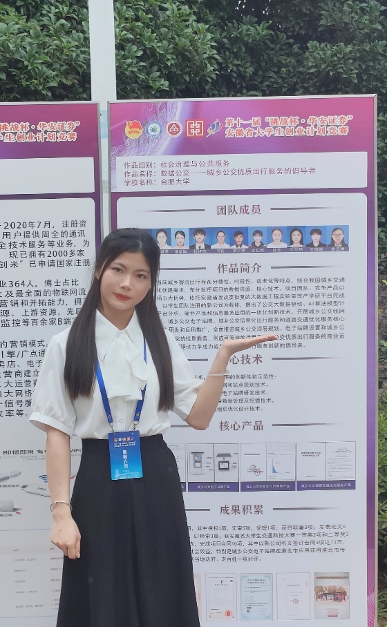 创新无止境,每一次创新都是一次挑战和机遇。研究生在读期间,李雨琪作为主要完成人参加第八届安徽省“互联网+”创新创业大赛并荣获金奖,第十届“挑战杯”安徽省大学生课外学术科技作品竞赛并荣获二等奖,作为团队负责人以《数据公交--城乡公交优质出行服务的倡导者》为题参加第十一届“挑战杯”安徽省大学生创业计划竞赛并荣获银奖。随后,她凭借竞赛优异表现被校团委推荐参加第十四届“创青春”安徽青年创新创业大赛并荣获省级铜奖,同时被校团委重点报道。最后她又带领团队成员参加2024年安徽省大学生创新大赛,期间每天往返于实验室和校创新创业大楼之间,最终完成了300多页的比赛计划书和37页的PPT,获得了省级金奖,并以学校第一排名晋级国赛。研二期间,她将一半的时间投入到学科竞赛中,这不仅为她赢得了诸多荣誉,更重要的是全面提升了她的个人综合能力,彰显了新时代青年的奋斗与担当。