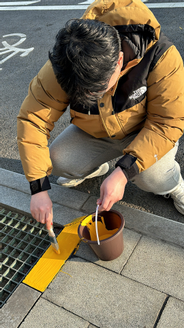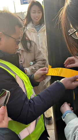 活动最后是动手实践环节,在技术人员的指导下,学生们动手参与荧光涂料的涂抹及荧光贴张贴。通过实际操作,学生们深刻体会到交通安全设施在夜间警示驾驶员与行人、降低交通事故风险中的重要作用。