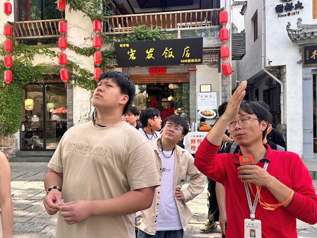 下午三点,同学们到达宏村景区,建筑系司大雄老师和授课老师洪云曦带队参观。导游详细讲解了宏村的历史背景及其徽州文化的独特魅力,重点介绍了古村落中的徽派建筑风格及其建造工艺。通过游览,同学们深入了解了徽州古建筑的设计理念,进一步提升了他们在专业学习中的实地考察和实践能力。