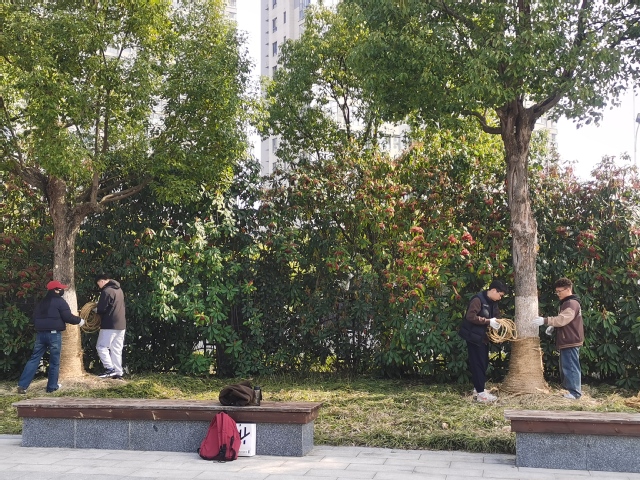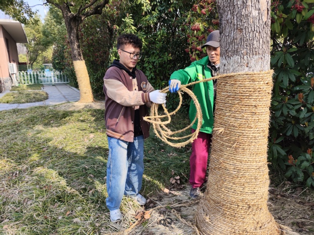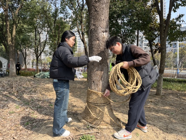 活动伊始,在公园管理处工作人员的安排下,园林工作人员对同学们进行了简单的培训,演示大树“脱衣”过程,讲解技巧与细节。学生党员们积极热情地投入劳动中,耐心解开防风麻绳,收拾整齐,以便日后回收利用。遇到粗壮的大树,学生们两两配合,经过几个小时的努力,志愿者们终于完成了所有的任务。