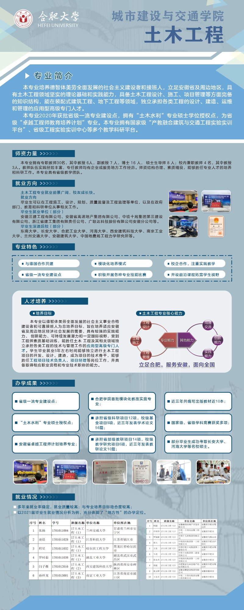 培养目标及特色:本专业培养德、智、体、美、劳全面发展的社会主义事业建设者和接班人,立足安徽省及周边地区,具有土木工程领域坚实的理论基础和实践能力,具备土木工程设计、施工、项目管理等方面完备的知识结构,能在装配式建筑工程、地下空间等领域,独立承担各类工程的设计、建造、运维和管理的应用型高级专门人才。借鉴德国应用型人才培养模式,落实“模块化”教育教学改革;探索“双元制”高等教育新模式,对标行业标准,推进新工科建设;组建现代产业学院,形成产教融合协同育人模式。