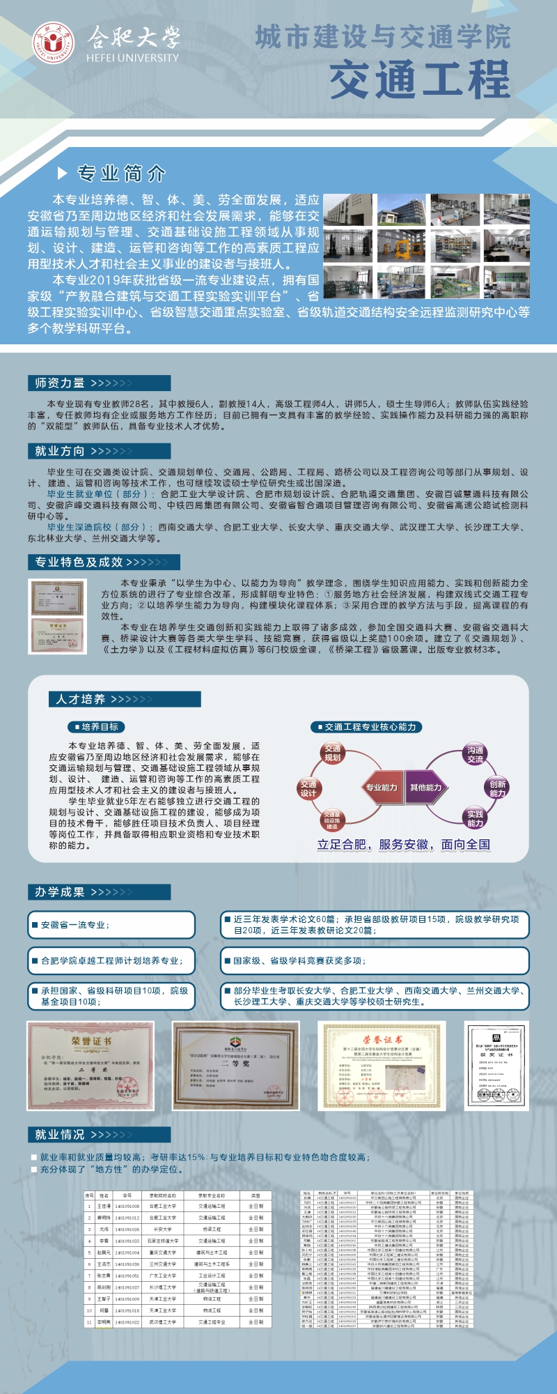 培养目标及特色:本专业培养德、智、体、美、劳全面发展,适应安徽省乃至周边地区经济和社会发展需求,能够在交通运输规划与管理、交通基础设施工程领域从事规划、设计、建造、运管和咨询等工作的高素质工程应用型技术人才和社会主义事业的建设者与接班人。以知识输出为导向,构建交通工程专业模块化课程体系;拥有国家级“产教融合建筑与交通工程实验实训平台”、省级工程实验实训中心、省级轨道交通结构安全远程监测研究中心等多个教学科研平台。