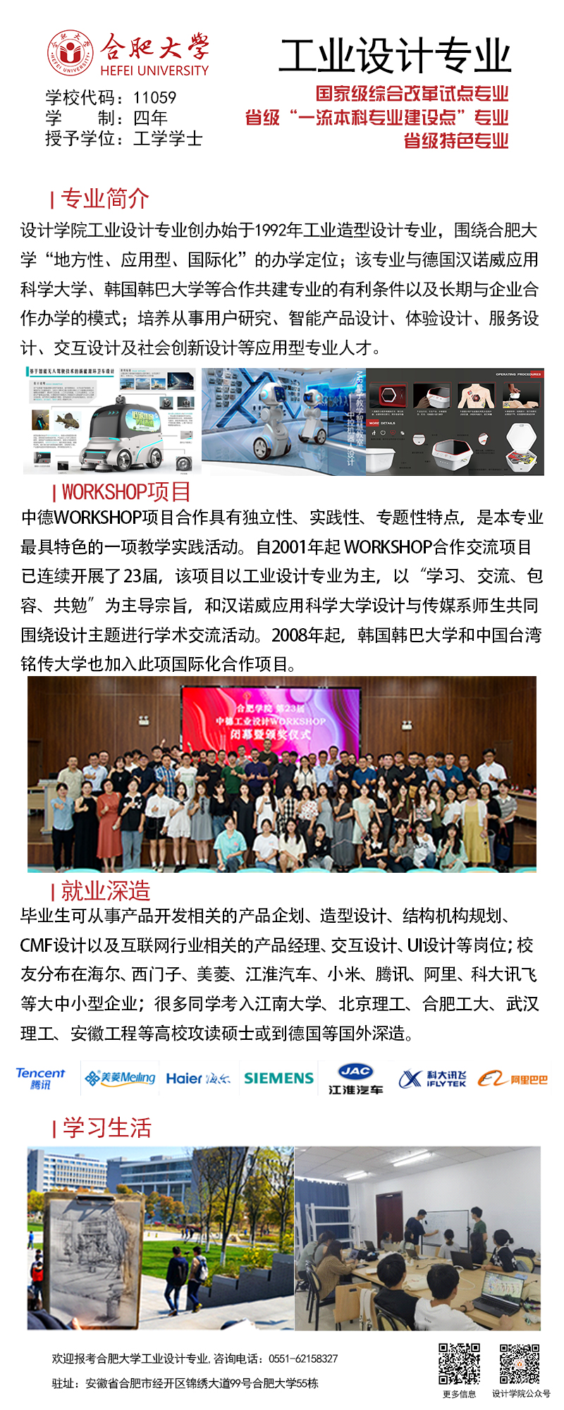 培养目标及特色:本专业培养德、智、体、美、劳全面发展,具有强烈的社会责任感、综合的创造性思维、领先的审美判断、科学的工作方法和团队合作精神;具备工业设计专业坚实的理论知识、创新品质和设计实践能力一专多能的高级应用型人才。本专业与德国多所应用科技大学长期交流合作,师生每年与德国师生开展中德WORKSHOP活动,至今已经举办了17届。在借鉴德国应用型人才培养先进经验的基础上,制定了以能力为导向的“宽基础、活模块、重实践”的模块化教学体系;通过与行业企业的产学研合作,以项目带动教学,将理论知识与设计实践有机结合,有效的提升学生设计应用能力;通过第二课堂各类专业设计竞赛,培养学生的创新意识及设计能力和团队合作精神。