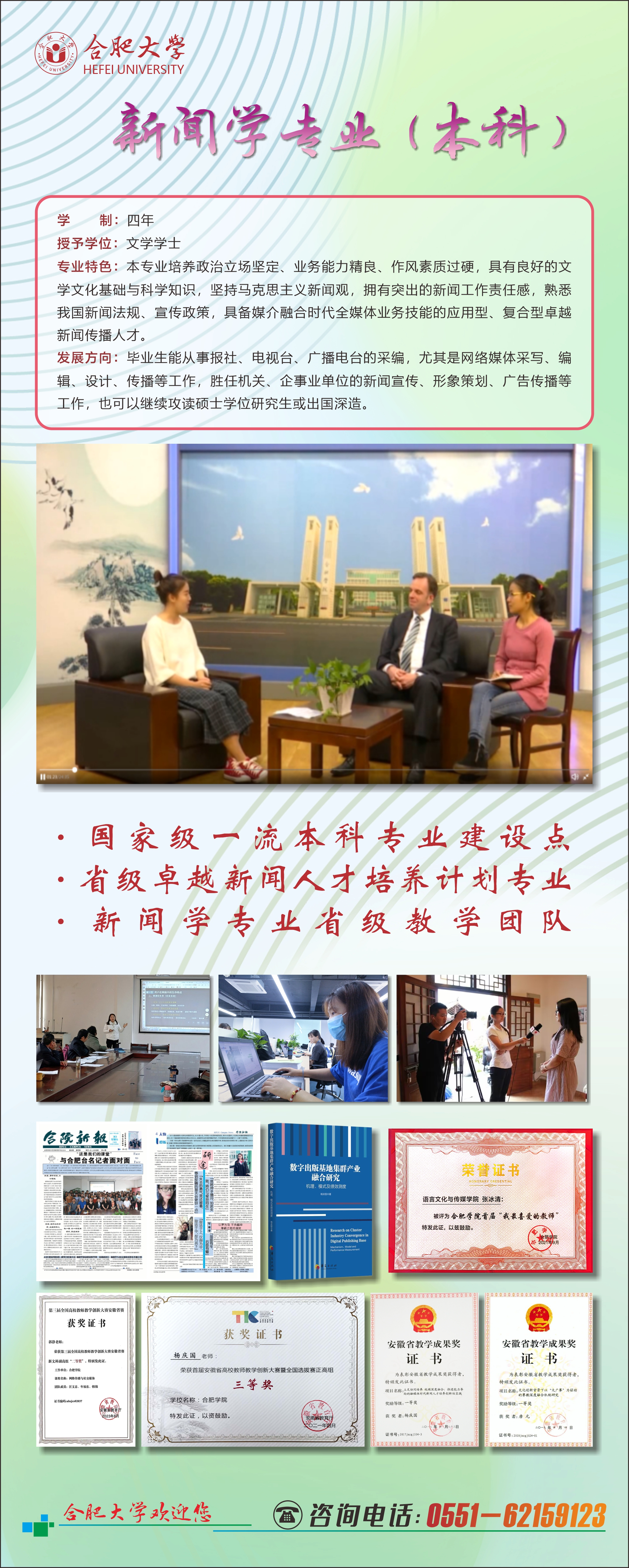 培养目标及特色:本专业培养德、智、体、美、劳全面发展,政治立场坚定、业务能力精良、作风素质过硬,具有良好的文学文化基础与科学知识,坚持马克思主义新闻观,拥有强烈的新闻工作责任感,熟悉我国新闻法规、宣传政策,具备媒介融合时代全媒体业务技能的应用型、复合型卓越新闻传播人才。本专业结合新技术与新产业,整合部校共建、校媒网络、校内专业共享等资源,在传媒技术、产品开发、经营管理等交叉领域实现“传媒+”跨学科发展;借鉴德国应用科学大学模块化教学改革经验,专业形成了以能力导向的应用型人才培养模式,不断推进实践赋能,构建“课程实验-校内实践-校外实习”综合实训体系;借助省委宣布部、省教育厅组织开展的“新闻单位从业人员与高校新闻传播院系互聘互挂”活动,打造新闻采写、电视编辑与制作、典型新闻案例、移动电子商务等近10门行业专家课程。
