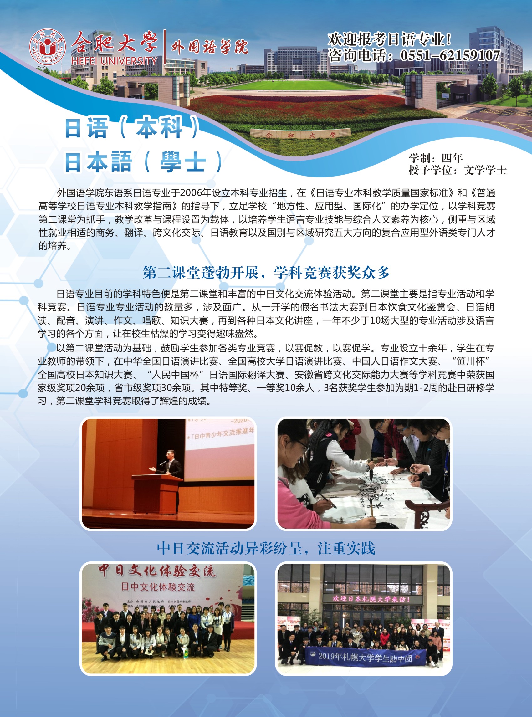 培养目标及特色:本专业培养具备家国情怀和社会主义建设主人翁精神,适应区域经济发展需要,德、智、体、美、劳全面发展,具有扎实的日语语言能力、广博的文化知识和较高人文素养,具备较强的日英双语应用能力与跨文化交际能力的日语专业人才。专业发挥第二课堂学科优势和产学研融合等专业培养特色,结合长三角区域的国际对外合作优势,对接毕业生就业需求设置商务日语、翻译实践日语、日语教育、日语跨文化交际和国别与区域研究五大方向课程体系,加强实践教学,培养适应我国对外交流、国家与地方经济社会发展、涉外行业、日语教育与学术研究等工作领域需要的复合应用型外语类人才。