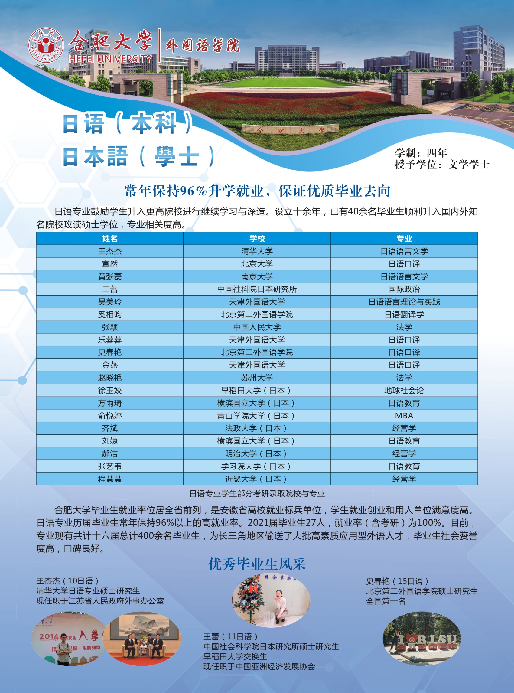 毕业生发展方向:毕业生可在企事业从事日语语言的语言服务、涉外翻译、文化外宣、外贸销售与咨询、语言教育等相关工作;也可在中等教育学校、高等院校、科研机构和国家机关从事教学、科研和行政管理工作;也可继续攻读硕士学位研究生或出国深造。