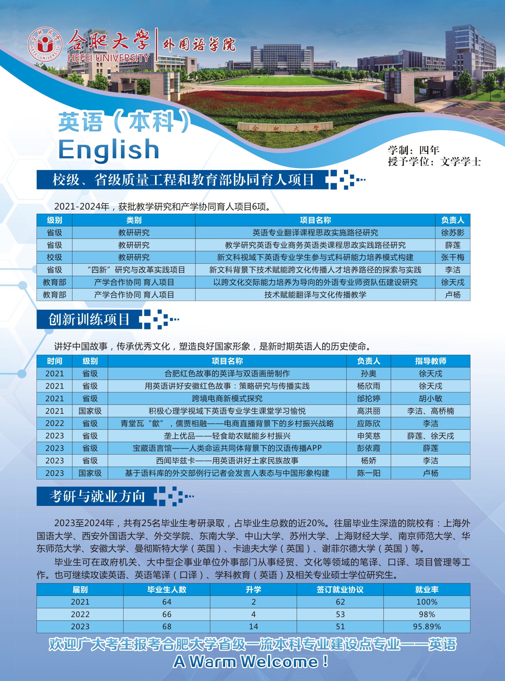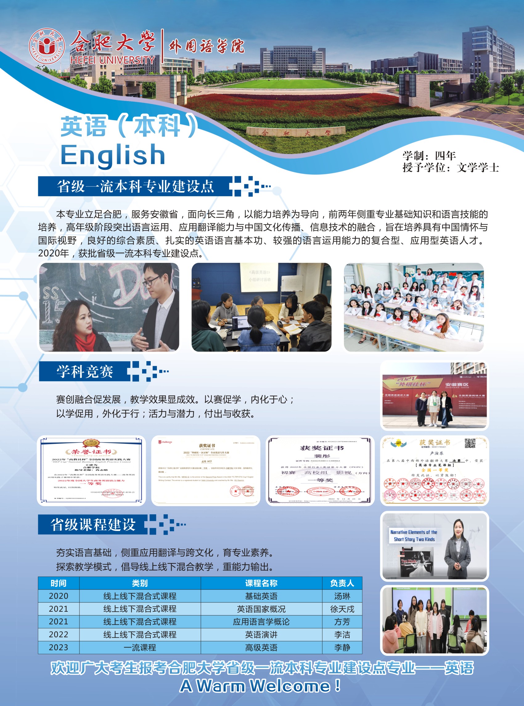 培养目标及特色:本专业培养德、智、体、美、劳全面发展,具有良好的综合素质、扎实的英语语言基本功、较强的语言运用能力和应用翻译能力、厚实的英语专业知识和必要的英语教育或商务英语专业知识与技能,能适应安徽、合肥与环巢湖地区区域经济一体化发展和对外宣传需要,可熟练使用英语从事涉外行业、语言服务行业和英语教育教学等项目管理、应用翻译、教学等相关工作的具有较高跨文化传播能力的复合型、应用型英语人才。本专业注重自主学习平台建设,打造分层次的集中实践和课内实践教学体系,开拓应用能力培养的课内外输出路径,提升了学生讲述中国故事、安徽和合肥外宣话语的写作、演讲、翻译和阐释能力。