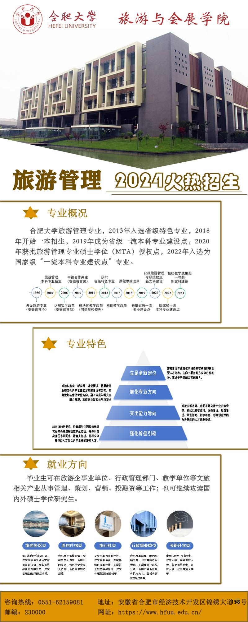 培养目标及特色:本专业培养德、智、体、美、劳全面发展、适应安徽省乃至长三角地区旅游发展需要,能够在文旅及相关产业从事智慧旅游管理、旅游产品策划营销、旅游咨询培训等工作的应用型、创新型、国际化人才。注重培养学生旅游企业智慧化管理能力、旅游产品策划营销能力、数字化技术应用能力、创新创业能力。通过构建校企合作网络、协同创新育人体系、新技术融合课程体系、综合性实践教学体系,促进产业、科技、教育融合,提高学生实践及应用能力。中文及英语导游考试通过率多年名列全市前茅。