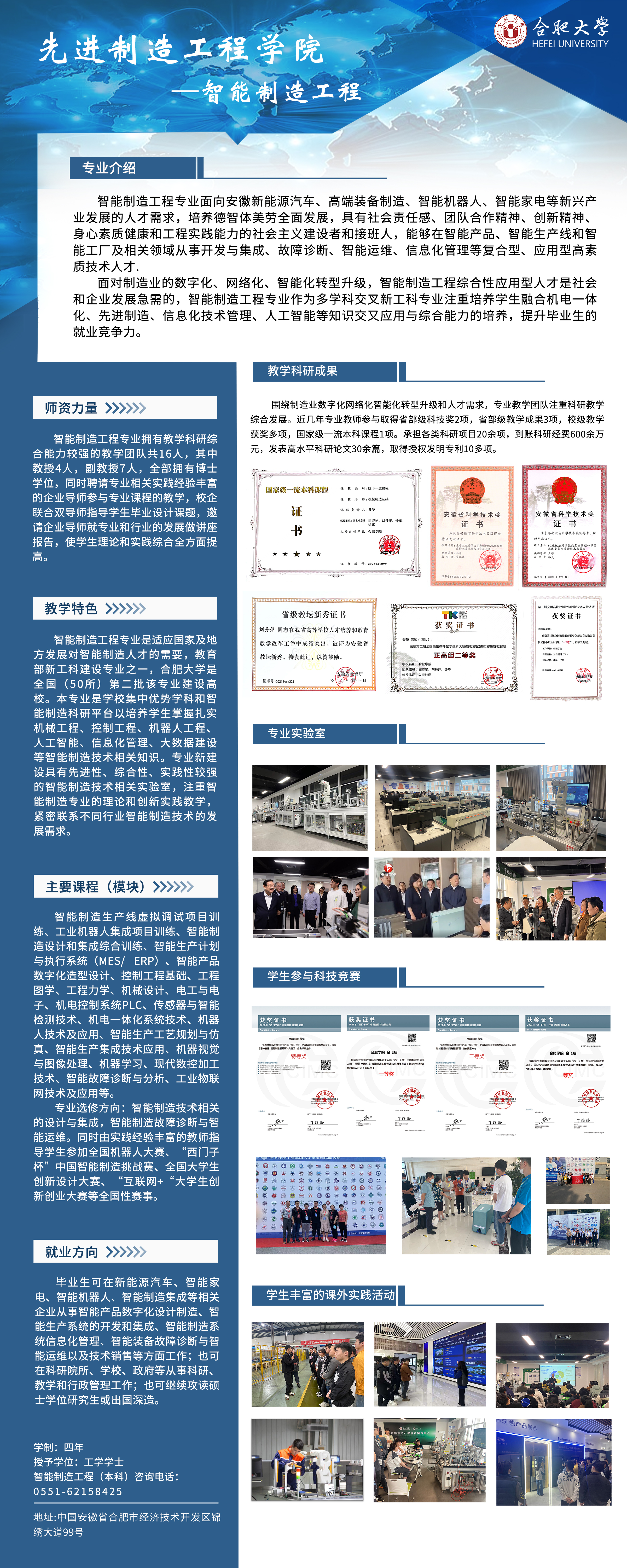 培养目标及特色:本专业培养德、智、体、美、劳全面发展,具有社会责任感、工程实践能力强、团队合作和创新精神,能够从事智能制造工程技术工作的复合型、应用型高素质技术人才。专业注重先进制造、自动化、人工智能、物联网和信息化管理等基础知识交叉融合应用与综合能力的培养。专业设置智能产品设计集成与故障诊断、智能制造设计开发与系统集成和智能工厂故障诊断与智能运维等方向。