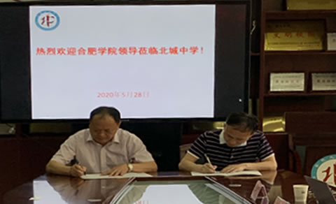 2020年5月28日,合肥学院—合肥北城中学(合肥一中北城校区)“优质生源基地”签约授牌仪式在合肥北城中学行政楼会议室举行。合肥学院人工智能与大数据学院院长檀明、数学与统计系主任王磊、副主任牛勇、行政助理刘艳,合肥北城中学校长王东录、副校长王克成、校长助理贺东旭、年级部主任尹连辉,北城中学各年级部代表等领导出席会议。会议由合肥北城中学校长王东录主持。