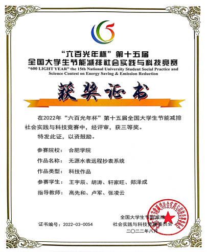 8月2日至5日,第十五届全国大学生节能减排社会实践与科技竞赛决赛在天津举行,我校先进制造工程学院本科生王宇辰、胡涛、轩家旺、郑泽成的作品《无源水表远程抄表系统》荣获全国三等奖,充分展现了我校学子的科研创新能力、实践能力和团队合作精神。
