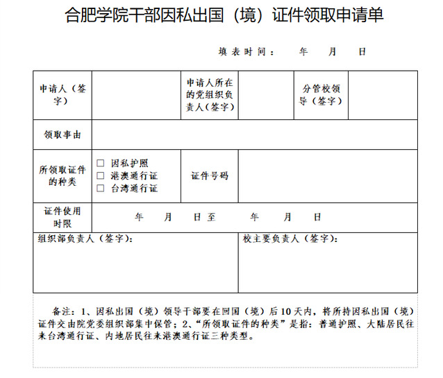 第十一条干部如须出国(境)或临时使用出国(境)证件,须由本人填写《合肥学院干部因私出国(境)证件领取申请单》(附件2),经所在单位主要负责人、分管校领导和校主要领导签字同意,报送学校党委组织部办理领用手续。