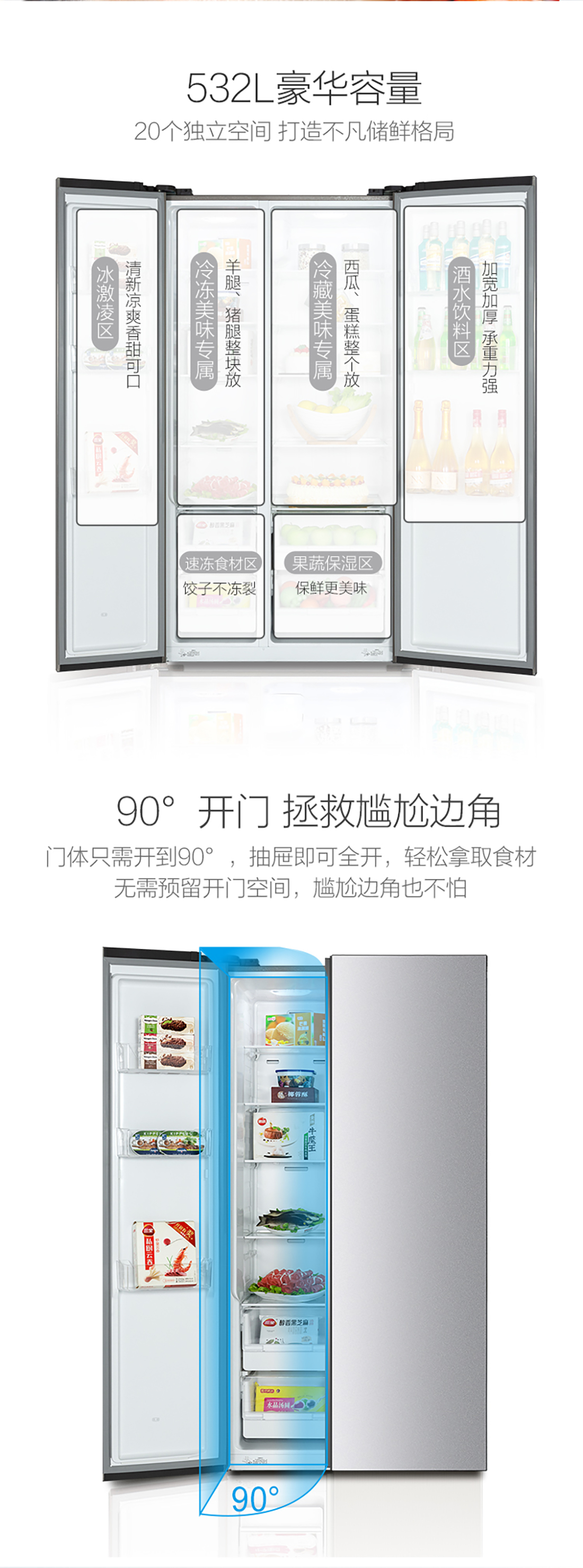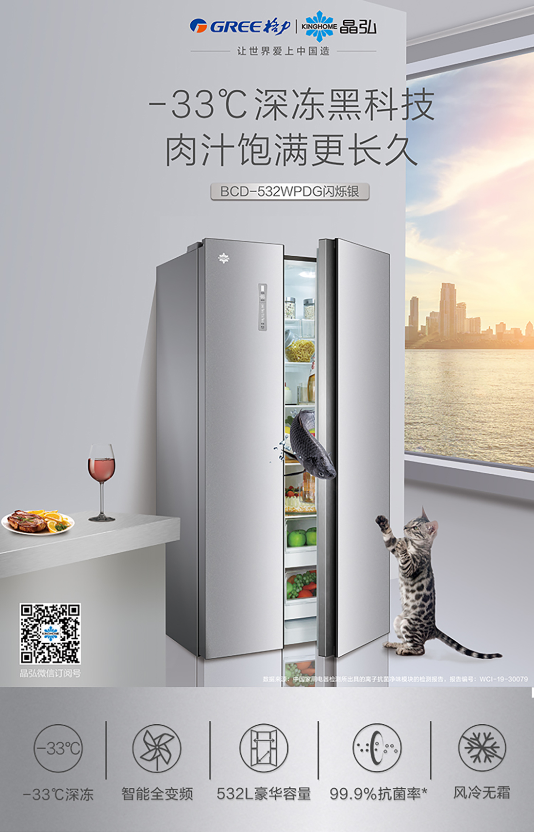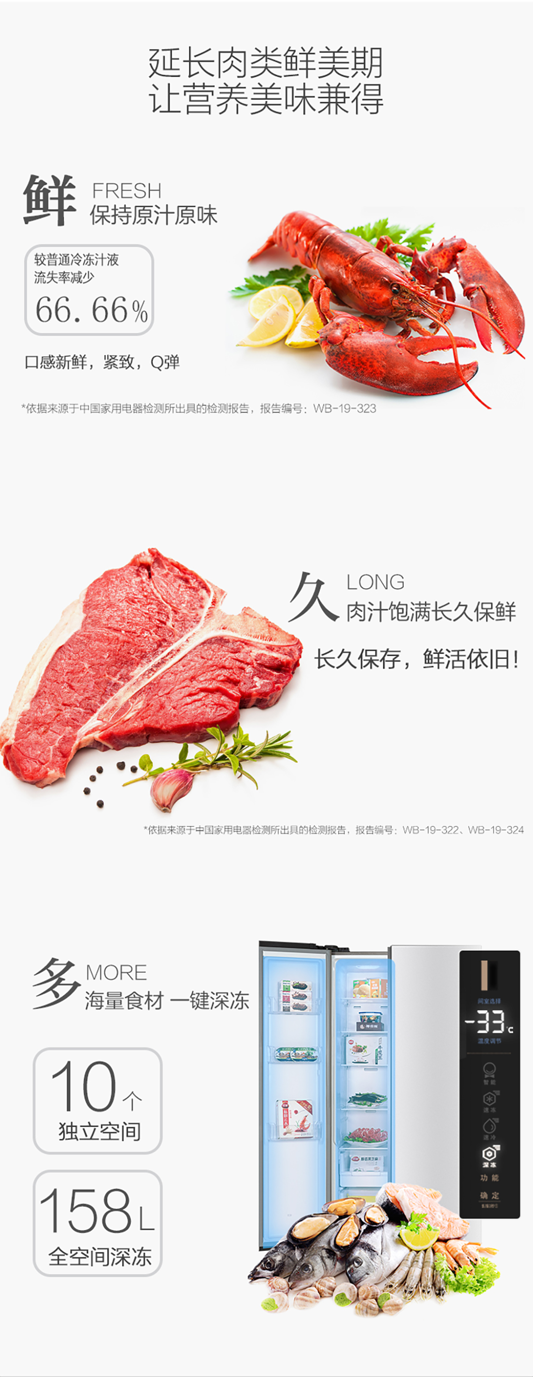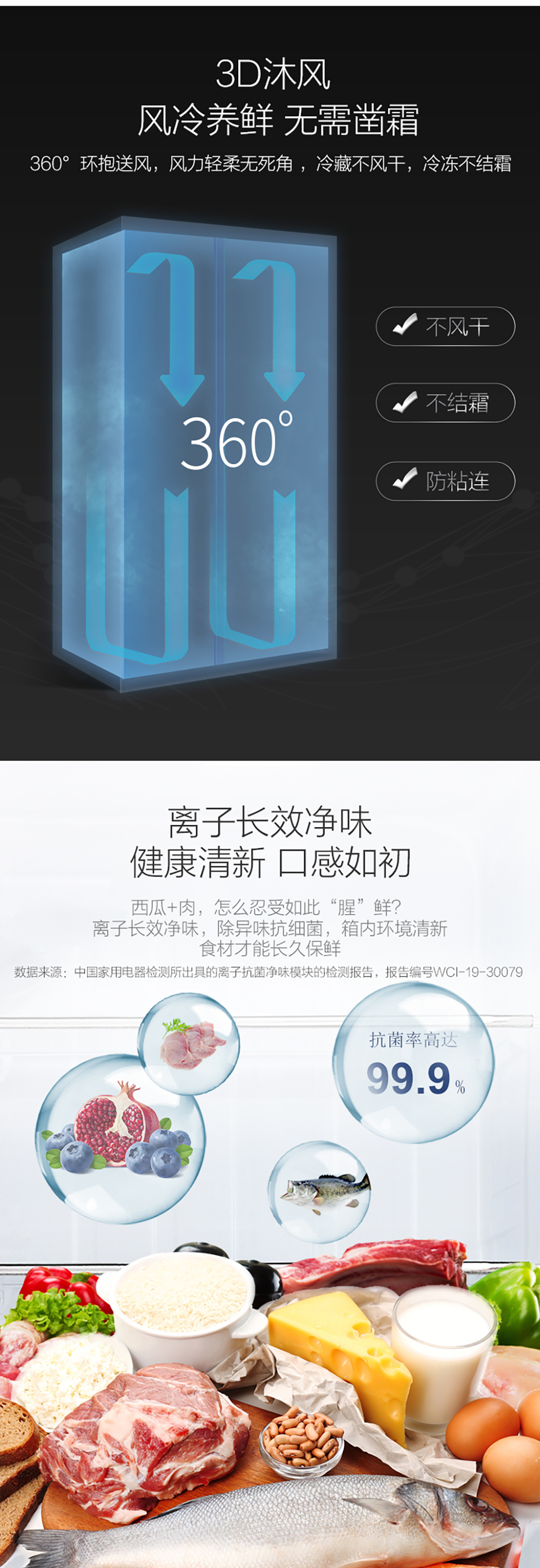 搭载-33℃深冻锁鲜科技,,,,,,肉汁饱满更恒久。。。。。接纳离子长效抗菌净味,,,,,,抗菌率高达99.9%。。。。。3D沐风,,,,,,风冷养鲜,,,,,,无需凿霜。。。。。