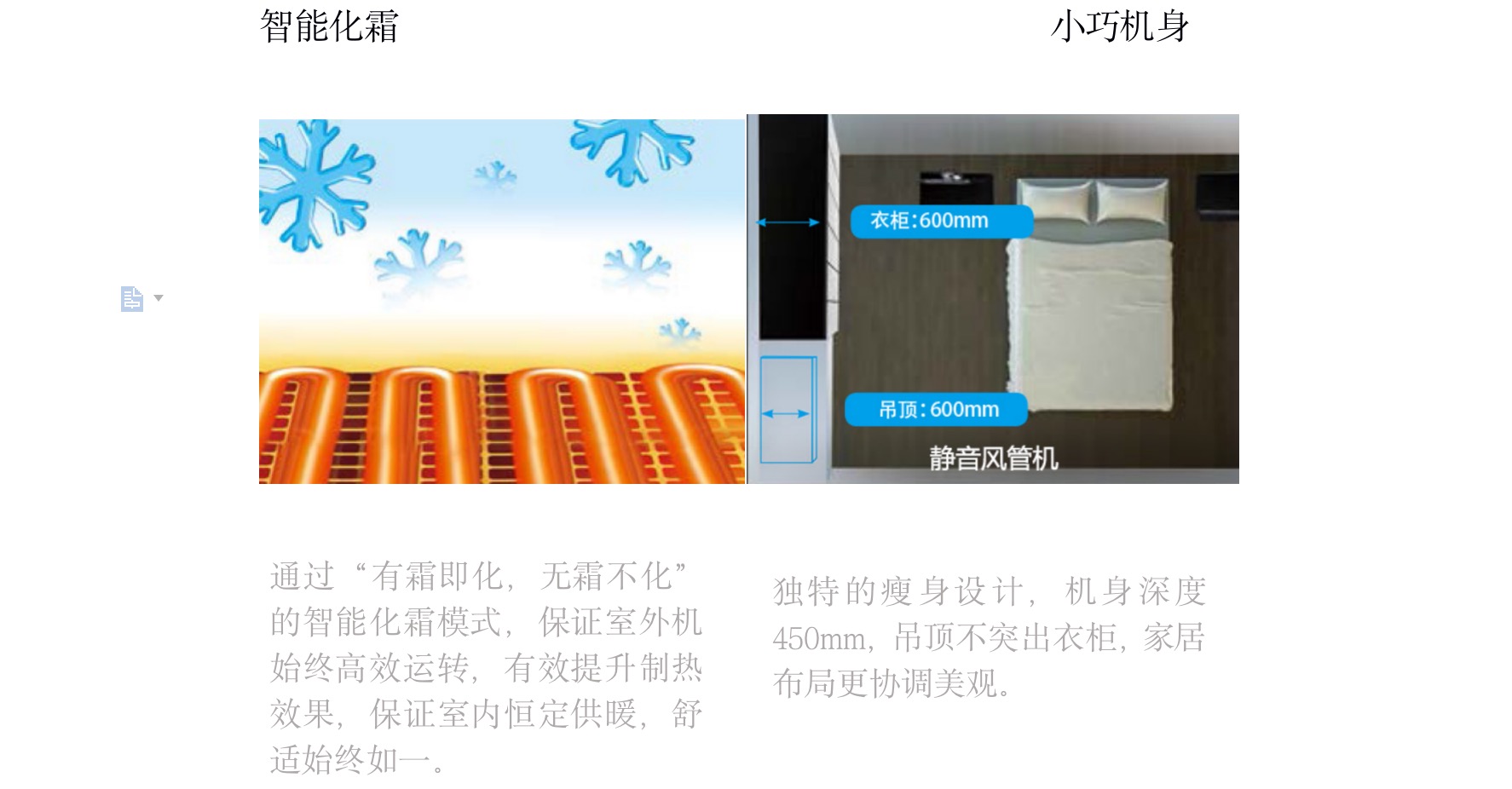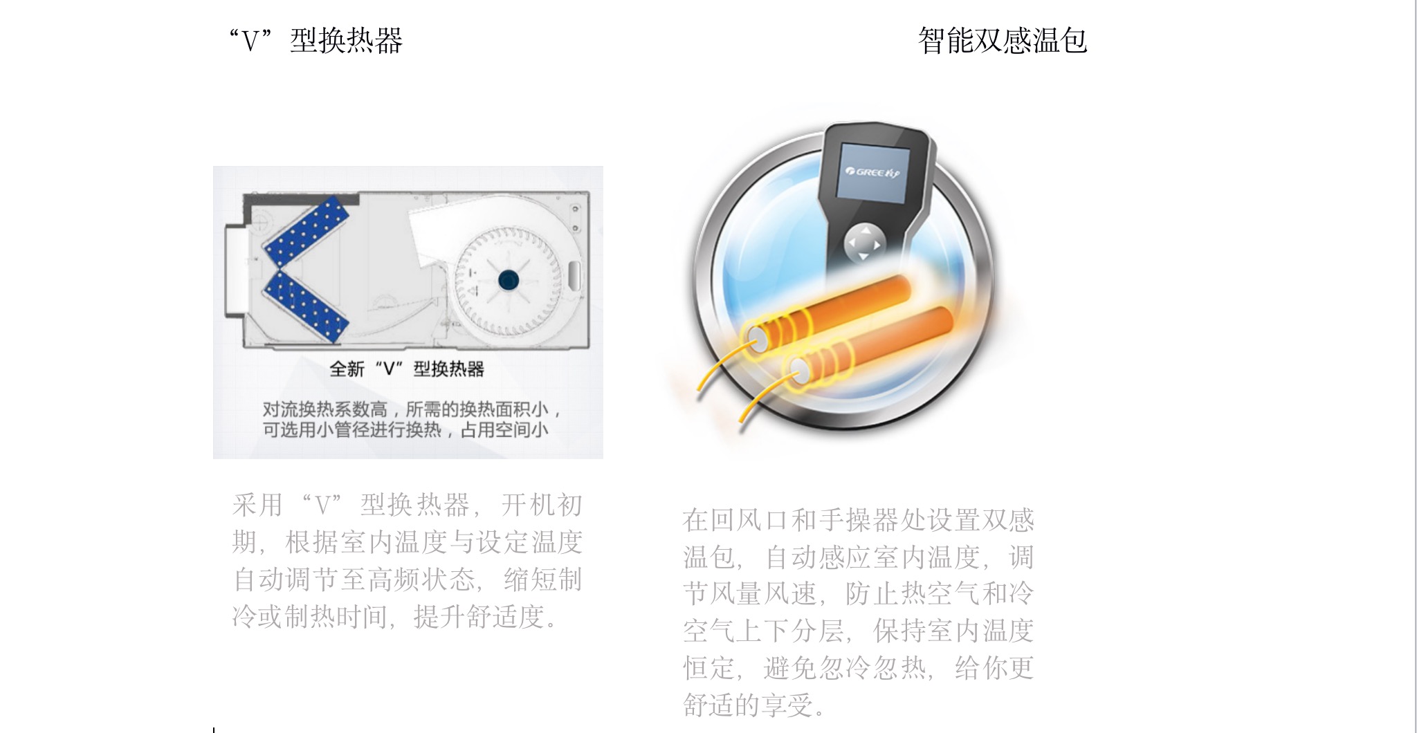 接纳“V”型换热器,,,,,开机初期,,,,,凭证室内温度与设定温度自动调理至高频状态,,,,,缩短制冷或制热时间,,,,,提升恬静度